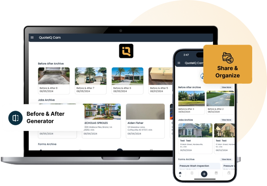 QuoteIQ Cam is a photo management tool designed to help businesses organize and manage job-related images and documents efficiently. By storing all project photos in one place, it ensures your phone storage remain clutter-free, allowing you to keep track of project progress and share updates with your team and clients quickly and efficiently.